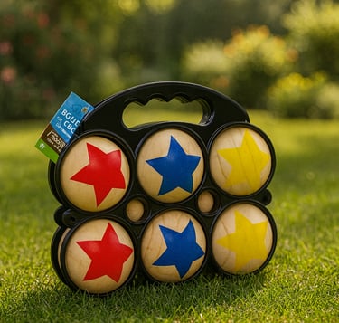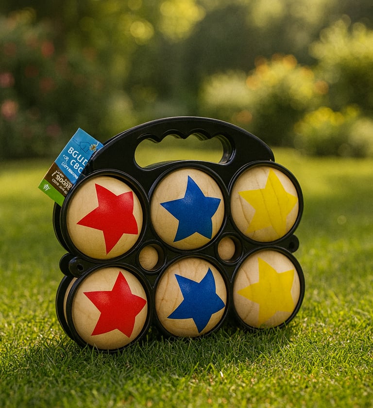 Notre set comprend 6 boules en bois colorées avec étoiles, 2 cochonnet et une caisse de transport pratique (dimensions : 22 × 17 cm). Grâce à sa légèreté et son format compact, il se transporte facilement et peut être installé rapidement.