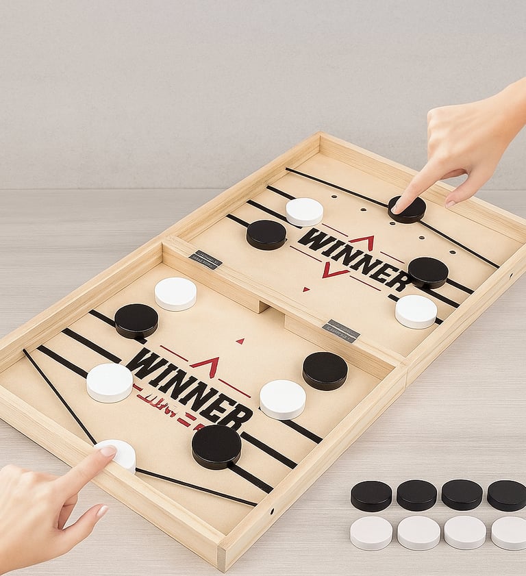 Le principe est simple : utilisez l’élastique pour propulser vos palets en bois dans le camp adverse à travers la petite ouverture centrale. Le premier joueur à avoir vidé son côté de tous ses palets remporte la partie. Rapide, amusant et addictif, c’est le jeu parfait pour mettre de l’ambiance.