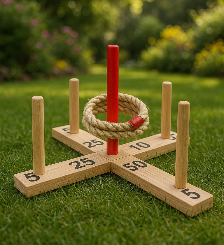 Notre jeu comprend une croix en bois de 50 × 50 cm avec plusieurs piquets numérotés, ainsi qu’un set d’anneaux en corde faciles à lancer. Grâce à son format pratique, il peut être installé rapidement et s’adapte à tous les publics, des enfants aux adultes.
