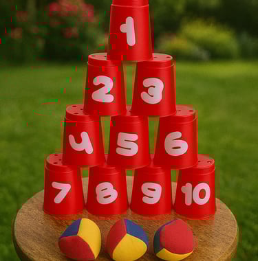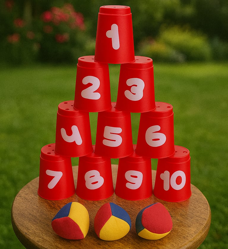 Notre set comprend 10 gobelets numérotés en plastique rouge (taille : 25 × 8 × 8 cm) ainsi que 3 balles adaptées pour jouer en toute sécurité. Léger et facile à installer, ce jeu convient aussi bien aux enfants qu’aux adultes.